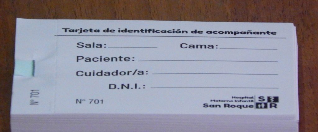 A partir de esta semana, cada sala tendrá un talonario con «tarjetas de identificación» para dispensar a quienes acompañen a los pacientes. De esta manera cada acompañante (sea la mamá, el papá u otro adulto) puede dar cuenta de su motivo de estadía en el hospital por fuera del horario, obedeciéndose siempre la regla de «1 acompañante por paciente».